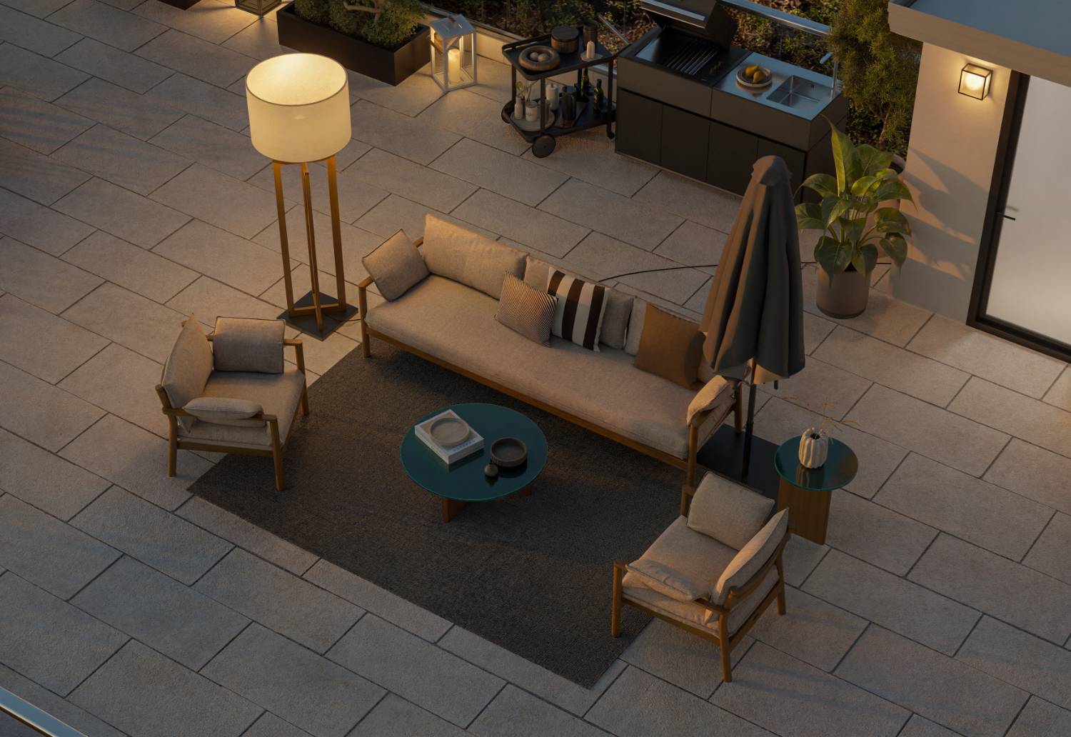 Večernji ambijent stvara mirnu, profinjenu atmosferu u kojoj se elegancija prostora savršeno spaja sa prirodnim okruženjem