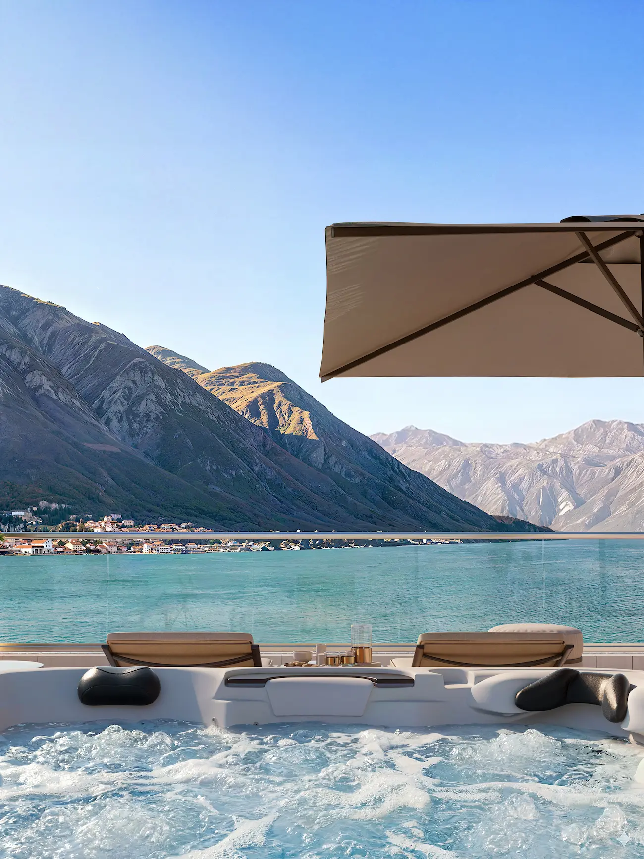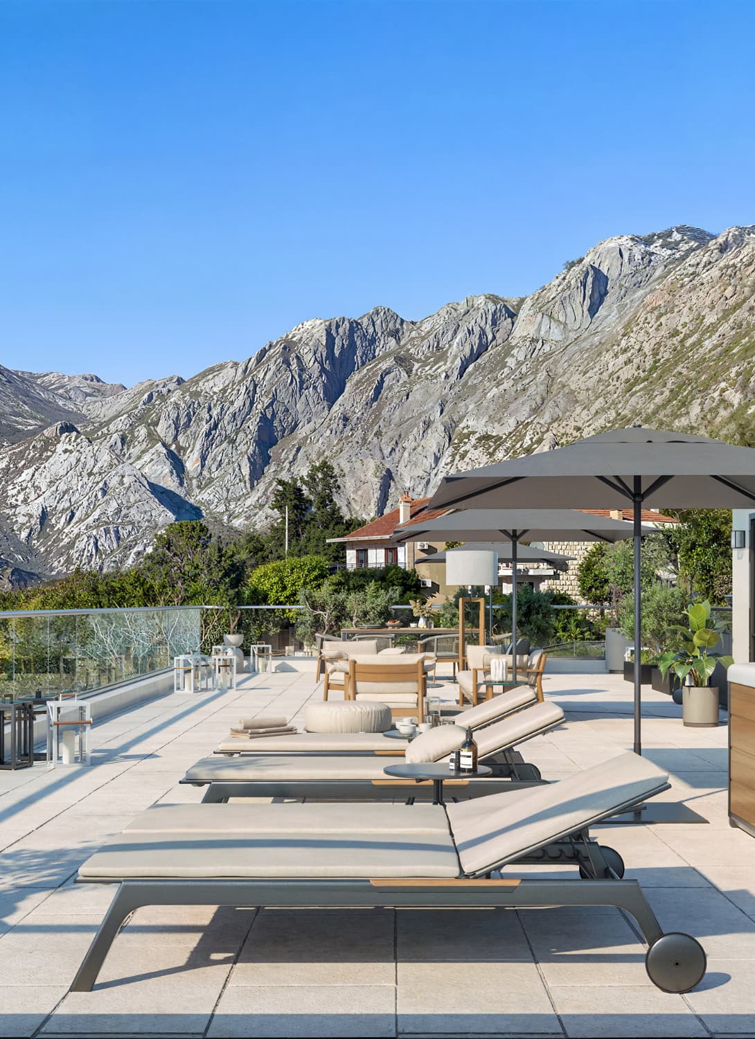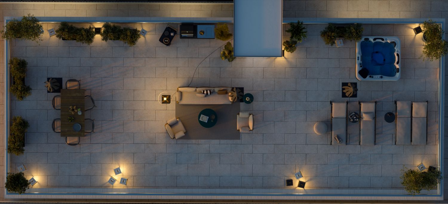 Posebnu vrijednost predstavlja privatna krovna terasa od 133 m², dostupna direktno iz stana. Ovaj prostor omogućava kreiranje više funkcionalnih zona: otvorenog dnevnog boravka, mjesta za sunčanje, ljetnje kuhinje, prostora za veče sa prijateljima ili mirnog jutarnjeg rituala uz pogled na zaliv. Zahvaljujući potpunoj privatnosti i panoramskim pogledima, terasa postaje jedan od najposebnijih elemenata stana.