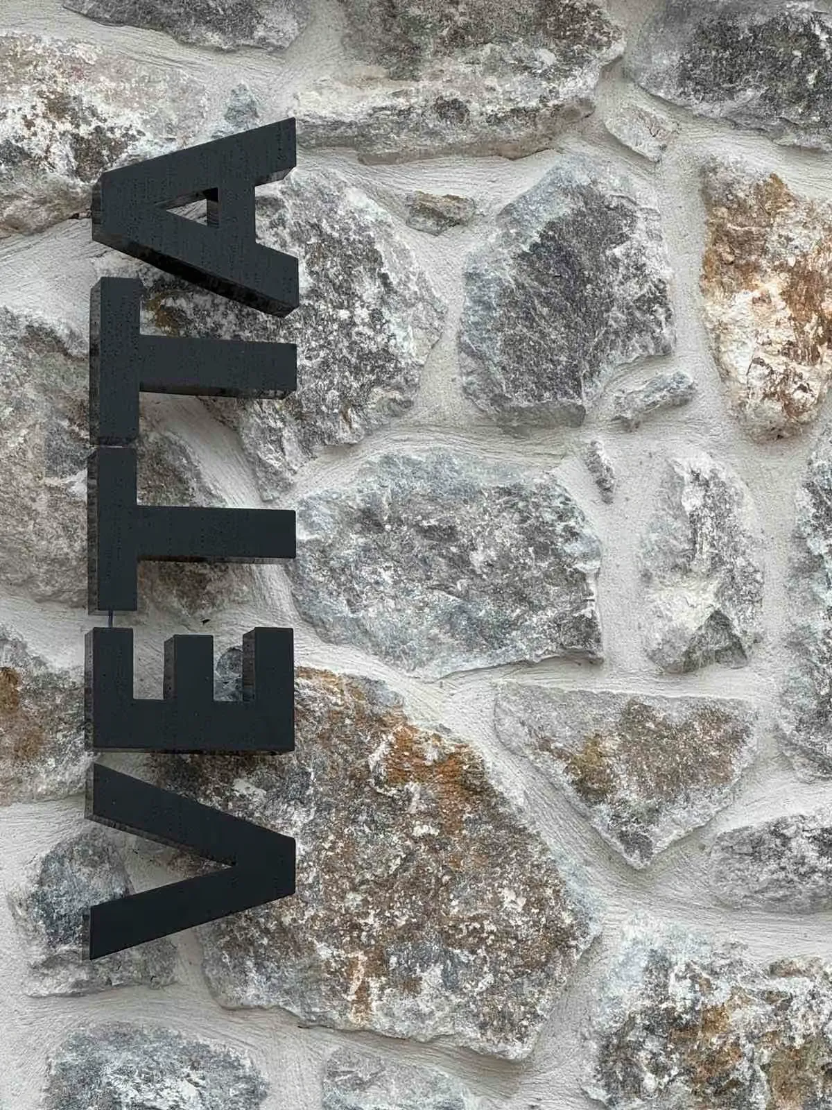 Arhitektura objekta oslanja se na čiste linije, velike staklene površine i slojevito uklopljene prirodne materijale koji daju posebnu lakoću i eleganciju. Kombinacija kamena, stakla i toplih neutralnih tonova omogućava Vetti da se skladno uklopi u mediteranski pejzaž Tivta, dok istovremeno zadržava savremen i prepoznatljiv karakter.